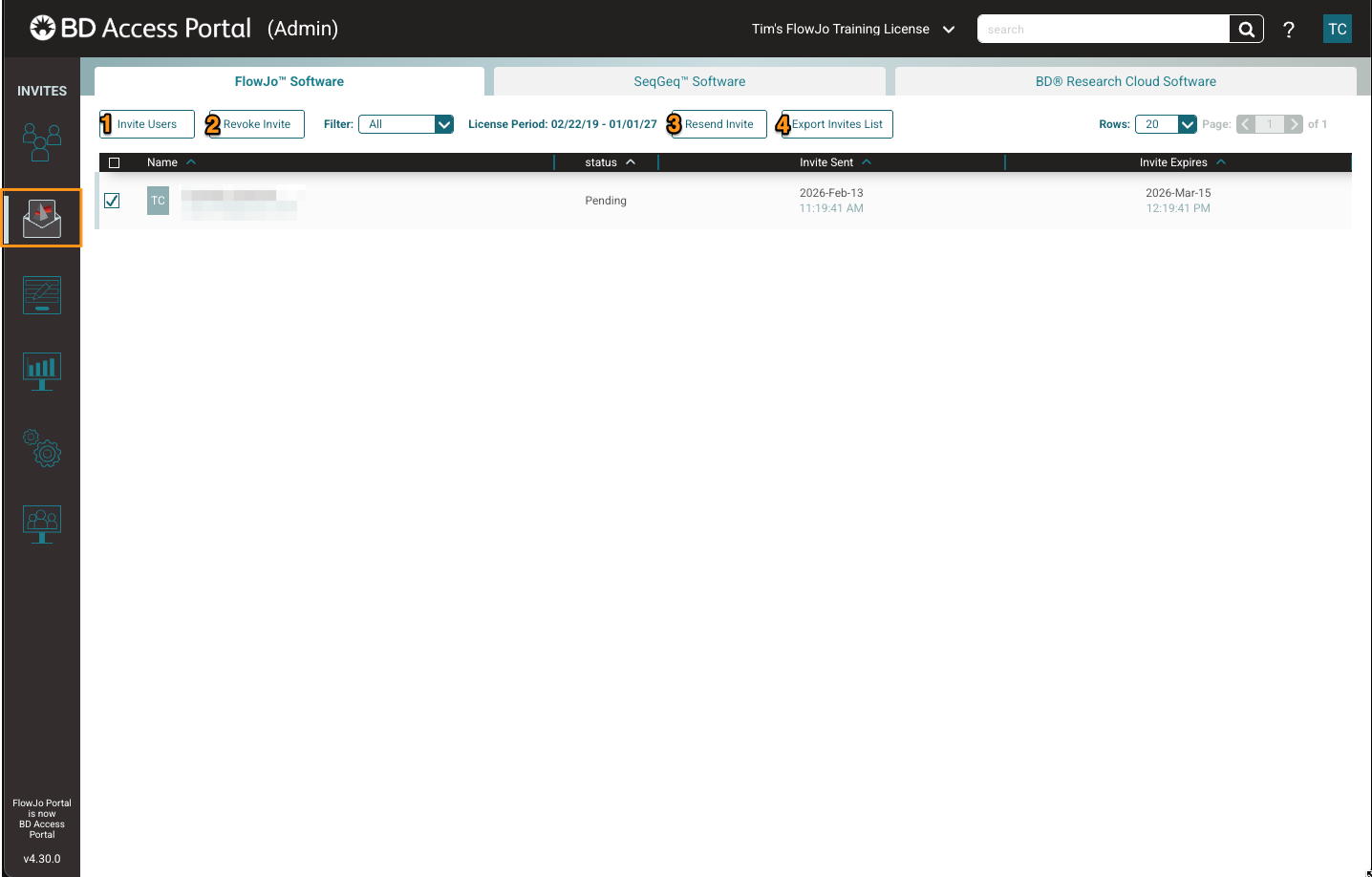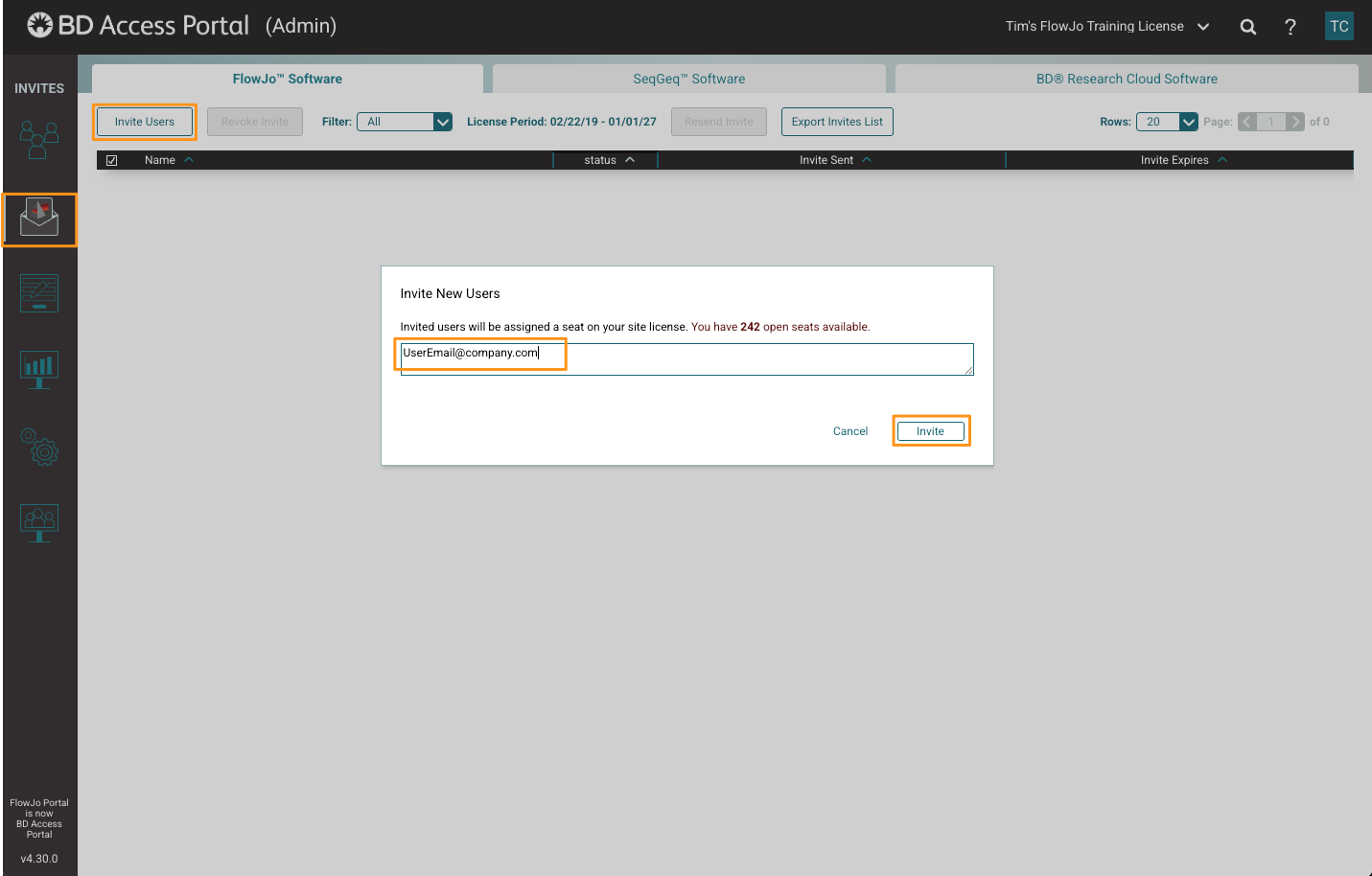 *If a user has not received their invite and you have confirmed that they have a valid email address, have the user check their spam or junk folders. If the invite from no-reply@flowjo.com cannot be located in the user’s inbox or spam/junk folders, please contact james.kidwell@bd.com, so we can check out email sender’s bounce list.