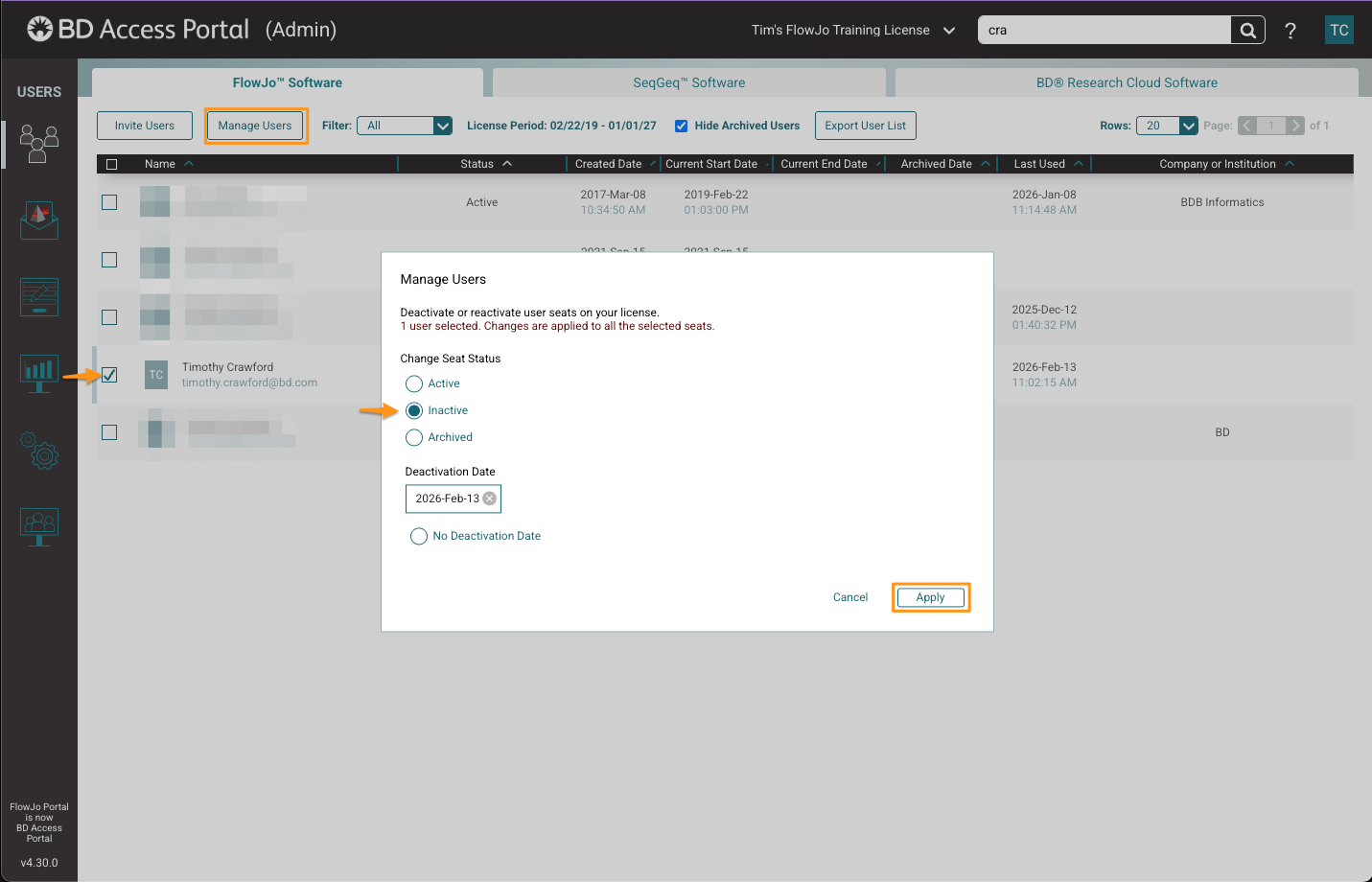 - Setting a deactivation date – Makes the user inactive on a specific date and frees up a seat on the group license on that specified deactivation date. This is a nice feature for admins who know a user’s termination date or day that the user will no longer need FlowJo™ , Infinicyt™ , and/or SeqGeq™ Software.