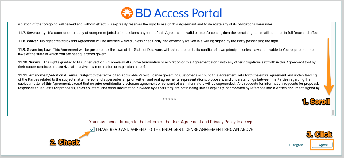 - Acceptance of the EULA and Privacy Policy is required in order to utilize the BD Access Portal. These legal agreements protect both the user and BD.