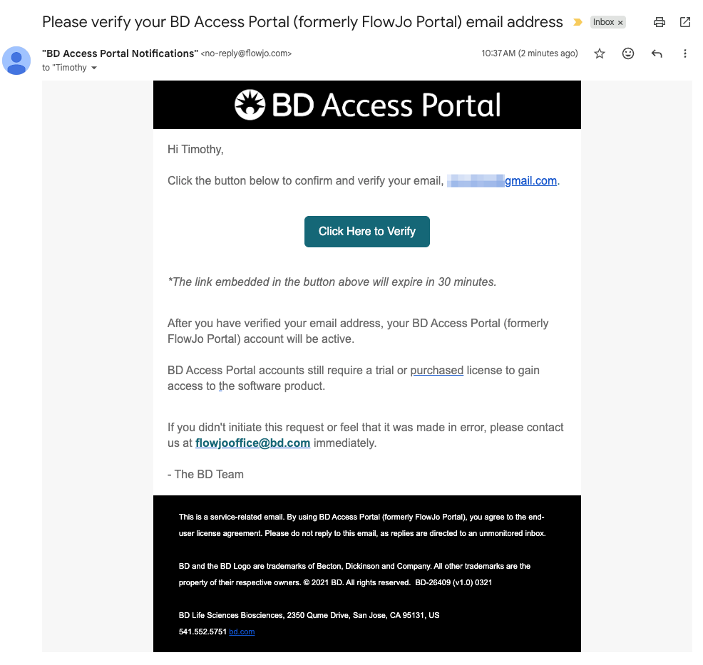 An email containing a "Click Here to Verify" link will be sent from no-reply@flowjo.com.
