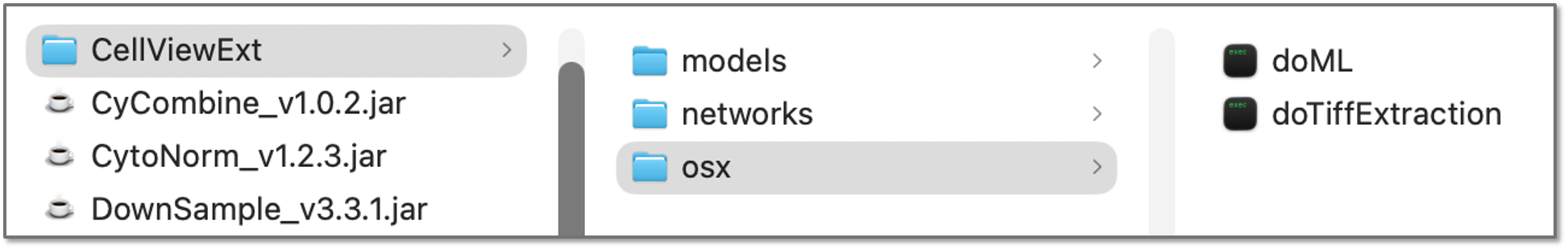 When you install and run the CellView Lens plugin, the doML and doTiffExtraction packages will unpack into the CellViewExt folder, in an operating system dependent subfolder called either OSX (Mac) or Win (Windows):