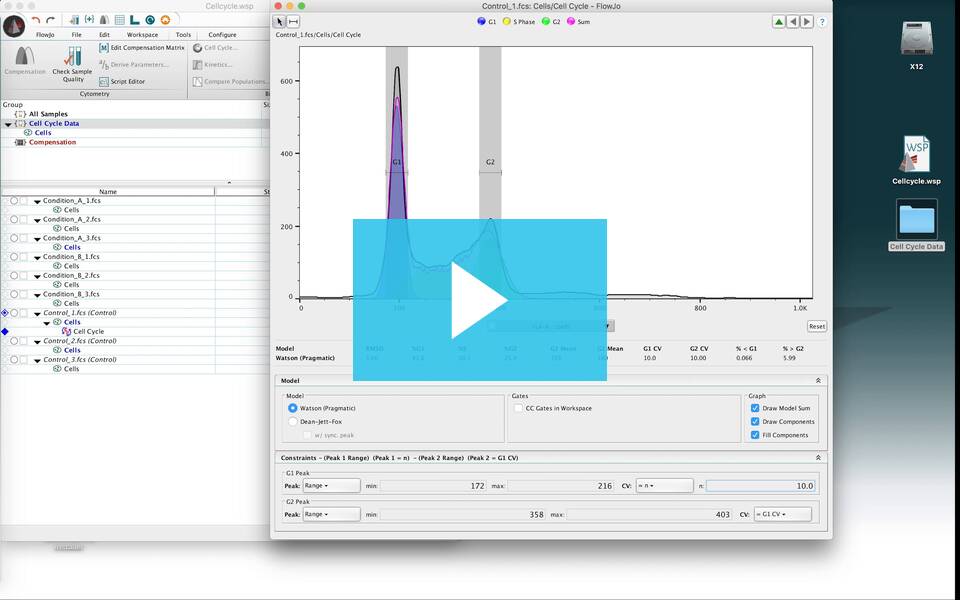 A Cell Cycle model, like any other node in FlowJo, can be applied to one or more samples either by dragging and dropping the node to other files or to the group. This process is explained on our copying gates page. If the model you create is unconstrained and then applied to multiple samples, FlowJo will create the best fit possible for all samples, unique to each sample. If you apply a constraint to the original file, that constraint will be applied to all other files that you drag the Cell Cycle model to. As an example, if you have an easy to model control file, you could create range gates around the obvious primary peaks. The constraint will have no effect on the model of the control, but if you apply this model to an experimental file in which the peaks are difficult to identify, the constraint will force the model to place the peaks in the same position as the control.
