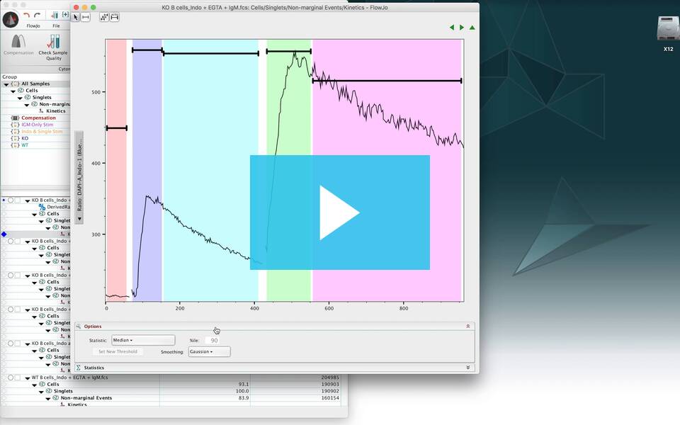 FlowJo opens a kinetics platform window when the kinetics node is applied to a population. If a parameter with the word ‘ratio’ in its name is present within the data it will be displayed on the Y-axis. If not, FlowJo will guess at the best parameter to use, and the user may click on the Y-axis parameter label to choose a different parameter if the guess is inaccurate. If no ratio parameter has been collected, but the individual parameters that comprise the ratio have been, the derived parameter platform can be used to create a ratio parameter. The default statistic applied to that parameter is the median. An example of the default plot is shown below.