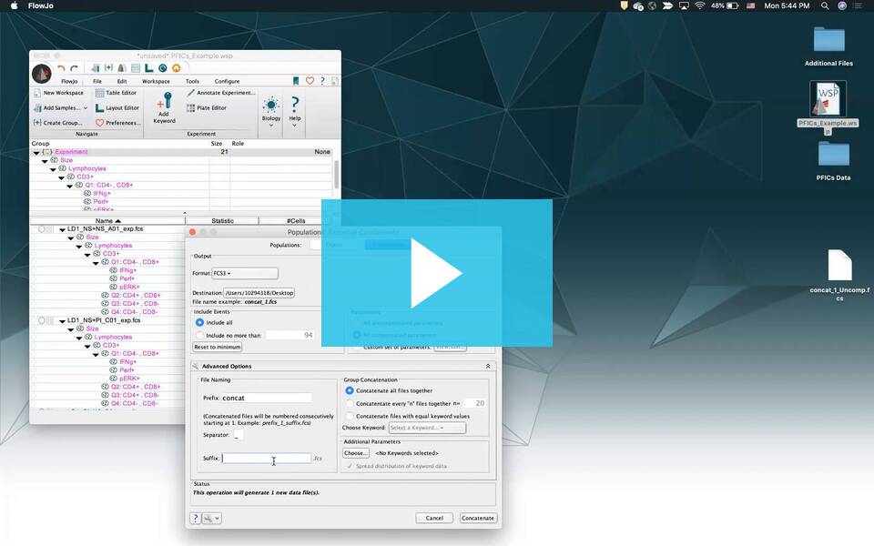 Exporting data from FlowJo is helpful for a variety of tasks. For example, you may need to create a new FCS file by merging multiple files together (concatenate) to facilitate rare event analysis, or export CSV files that include your workspace structure (gating tree and columns) for use in a downstream application.