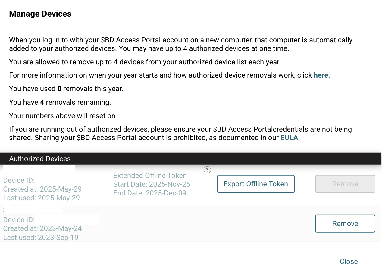 This will open a list of the devices that have been accessed using this BD Access Portal account. Locate the device ID that matches the Device Identifier shown in the BD Access Portal application. Press "Get Offline Token" for the matching device ID. This will open a window describing the limitations of the 14 day Extended Offline Token. Select "Create EOT" to generate a 14 day offline token for the selected device. Make sure you select the correct device! The offline token can only be used for the selected device and the portal account can not be used to login to any other devices for the next 14 days.