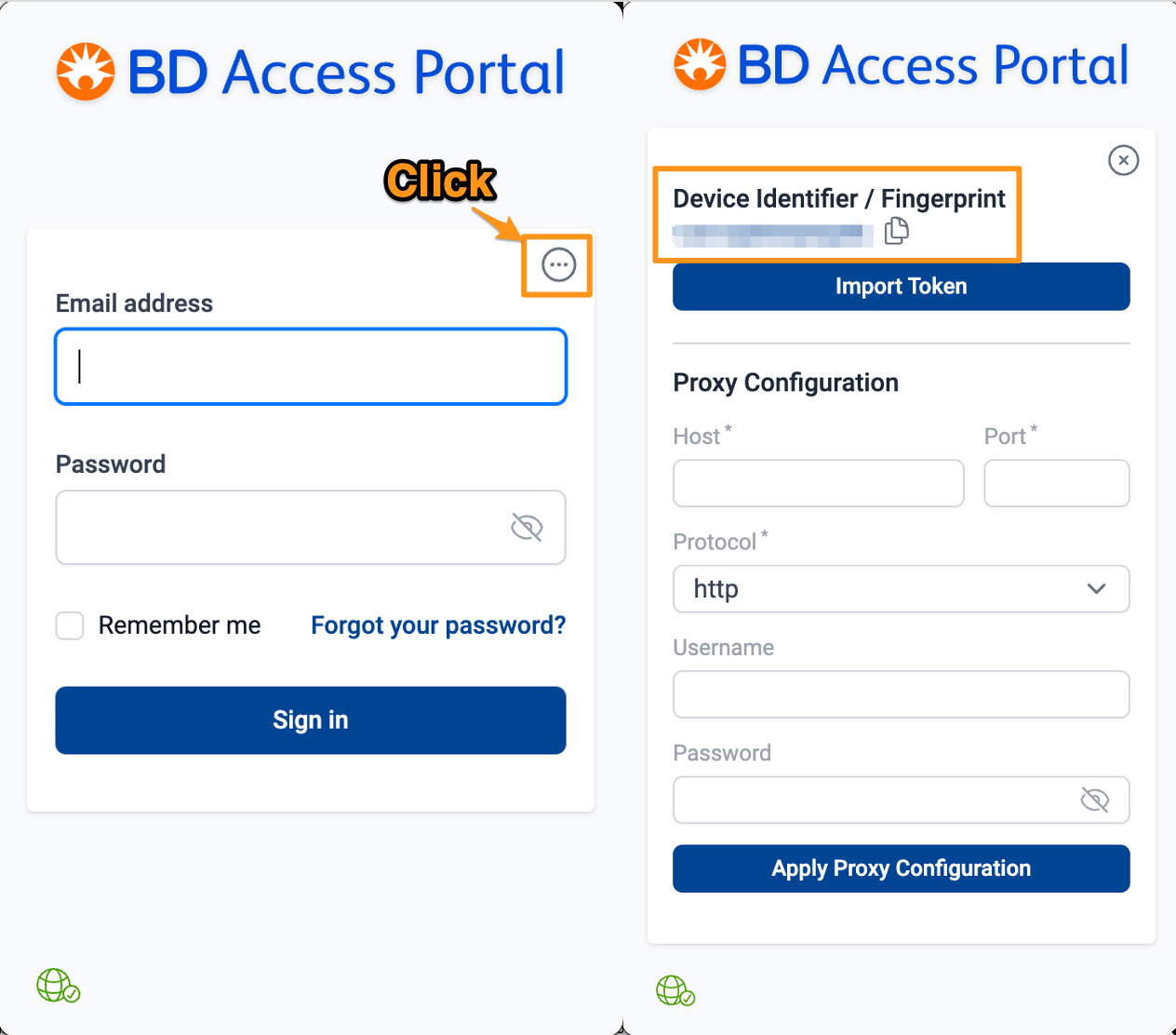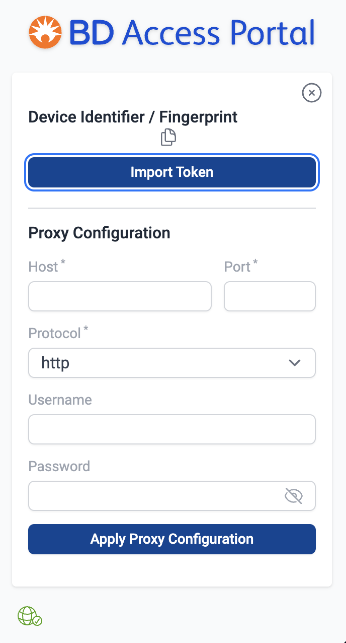 Open BD Access Portal and click on the three dots in the righthand corner to display the device identifier. Press the "Import Token" button and select the extended offline token that we just created on the computer. After selecting the Extended Offline Token a "Success" message should display. Return to the BD Access Portal login screen by clicking on the "x" icon in the top righthand corner. Login to the BD Access Portal using your email address and password. For the next 14 days you should now be able to login to the BD Access Portal even while the device is offline.