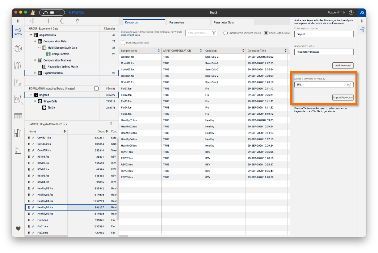 Meta-data, information about the data, can be added to your FCS (Flow Cytometric Standard) files either at the time of collection using the acquisition software or post-acquisition in FlowJoTM. All cytometers will automatically set minimal information through the use of keywords, which are short strings of text added to the header of FCS files identified by letter codes. The MetaData Manager, keyword tab, can be used to view, filter, or add additional keywords in FlowJoTM post-acquisition.