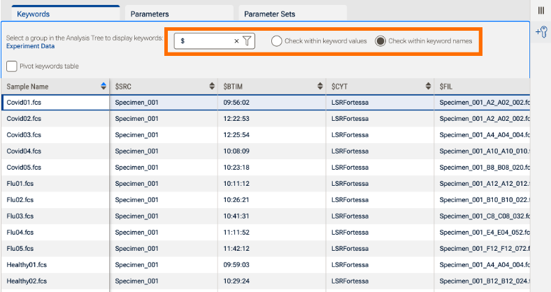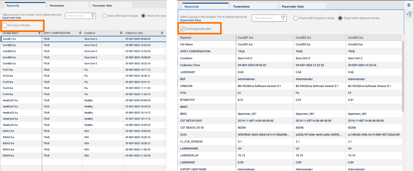 The keyword table displays the meta information organized by default as rows of samples and columns of keywords. This view can be pivoted to display rows of keywords and columns of samples using the Pivot Keywords Table checkbox, displayed in Figure 1.