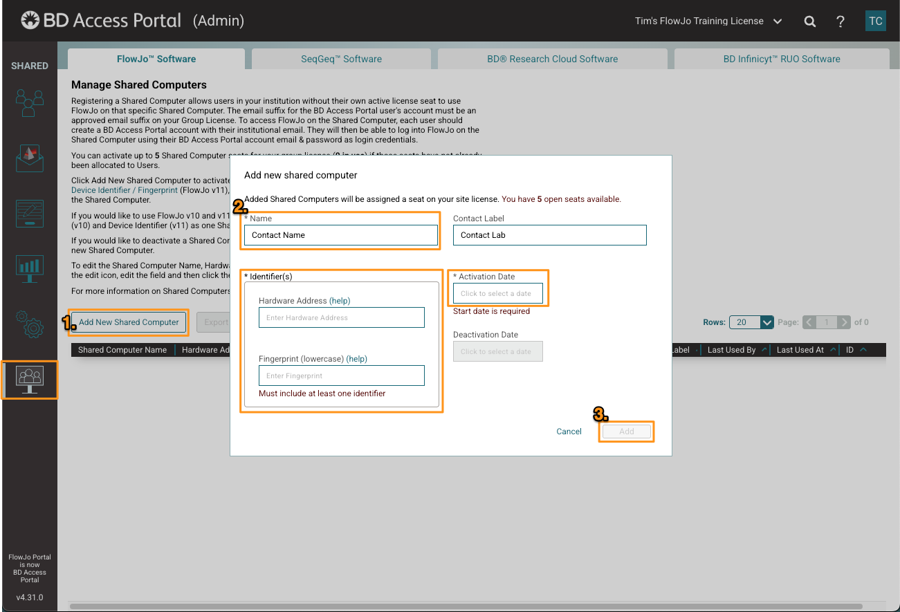 - Add the detected 12-digit Hardware Address from FlowJo™ v10 and/or add the 16-digit Device Identifier/Fingerprint from the BD Access Portal application to register the shared computer for access to FlowJo™ v10 and/or v11 and Infinicyt™, respectively. (at least 1 required)