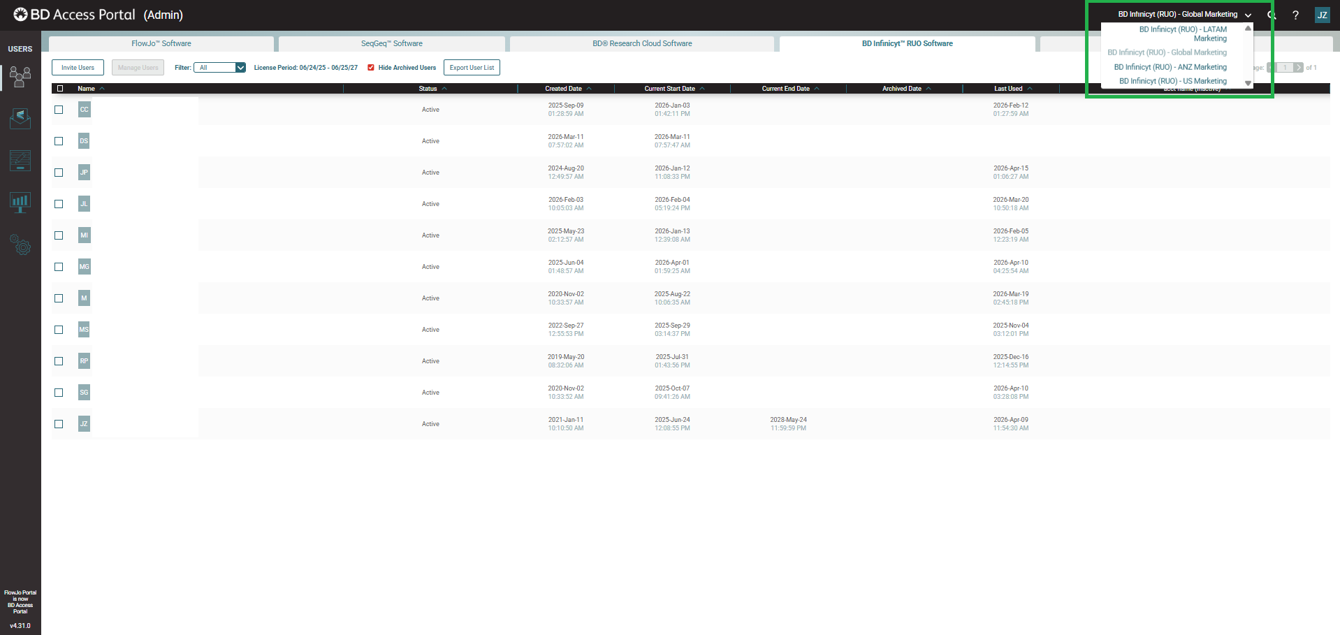 - Last Used Date: Date that the user last signed into the software with their BD Access Portal username/password