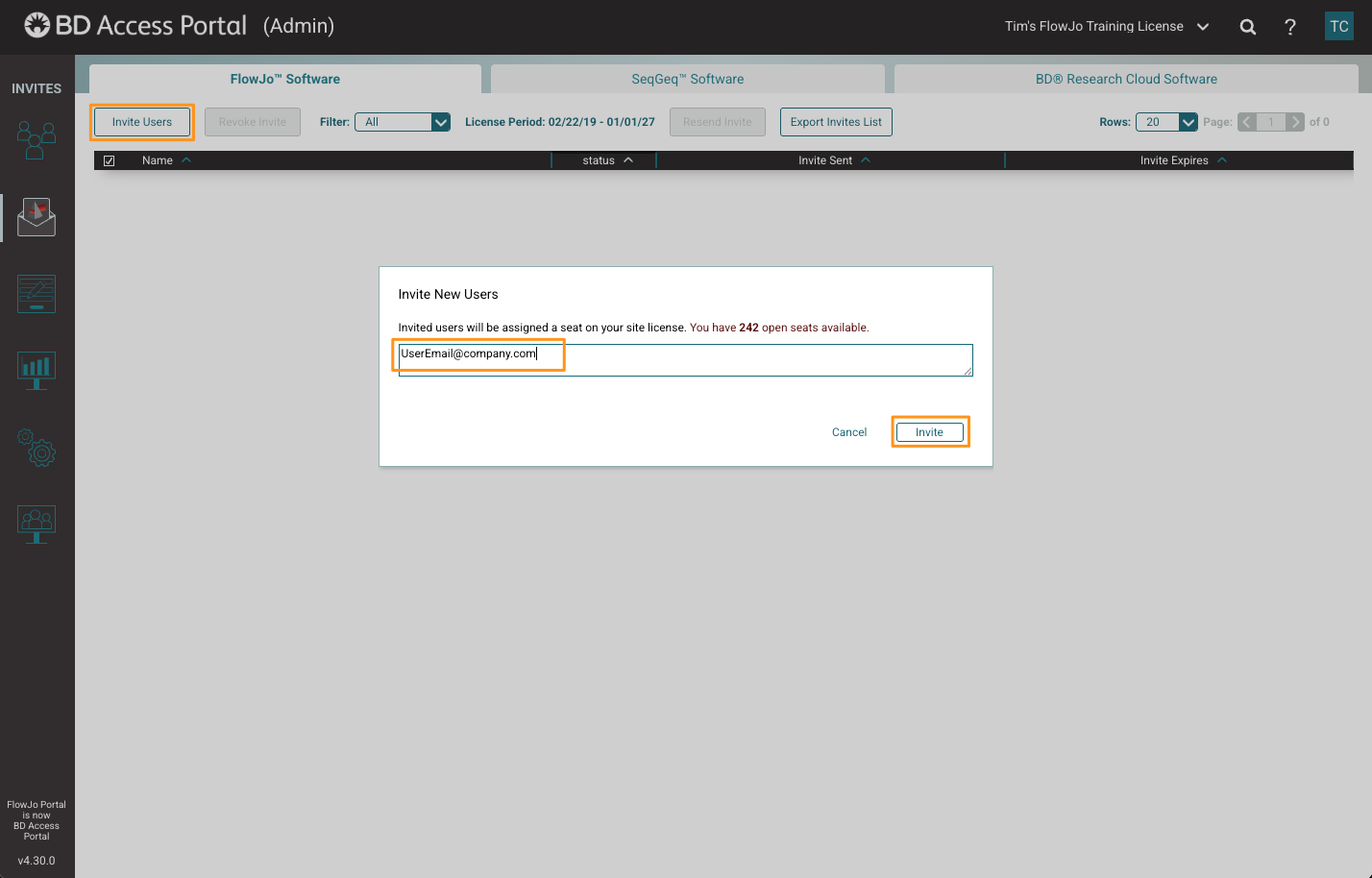Click “invite” to officially invite users once you have added email addresses Invited users will receive an email from no-reply@flowjo.com. This email address should be whitelisted on your network, so that the recipients can receive emails from this sender. The user will click on a button in the invitation email. That button will redirect them out to the create-user BD Access Portal page where they will create their account. After their account creation, the user will login to BD Access Portal and accept their group license invite via a pop-up banner on the top right corner of their BD Access Portal account page. After the user has clicked on the acceptance link in the banner, they will be an active user on the FlowJo Portal group license. The user can now login to FlowJo™, Infinicyt™, and/or SeqGeq™ Software with their BD Access Portal username/password.