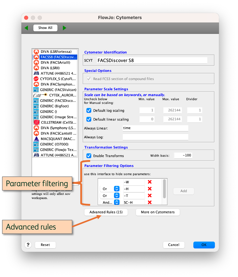 Figure 1 Parameter filtering and advanced rules for scaling FACSDiscover data