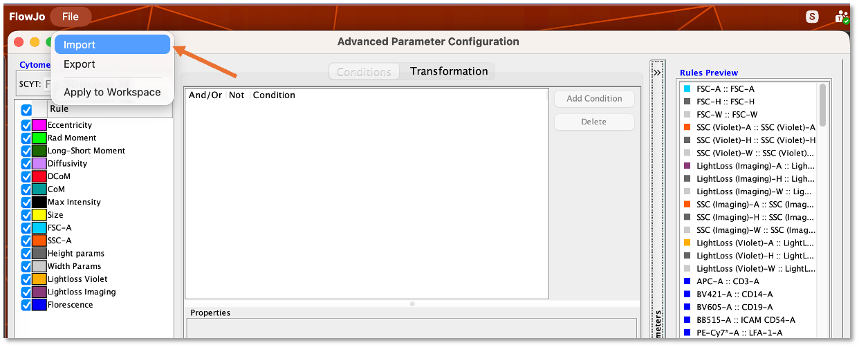 A complete set of advanced rules can be imported for the cytometers. Within the advanced preferences, the File menu contains options to Import or Export rules for specific cytometers, as shown on Figure 2.