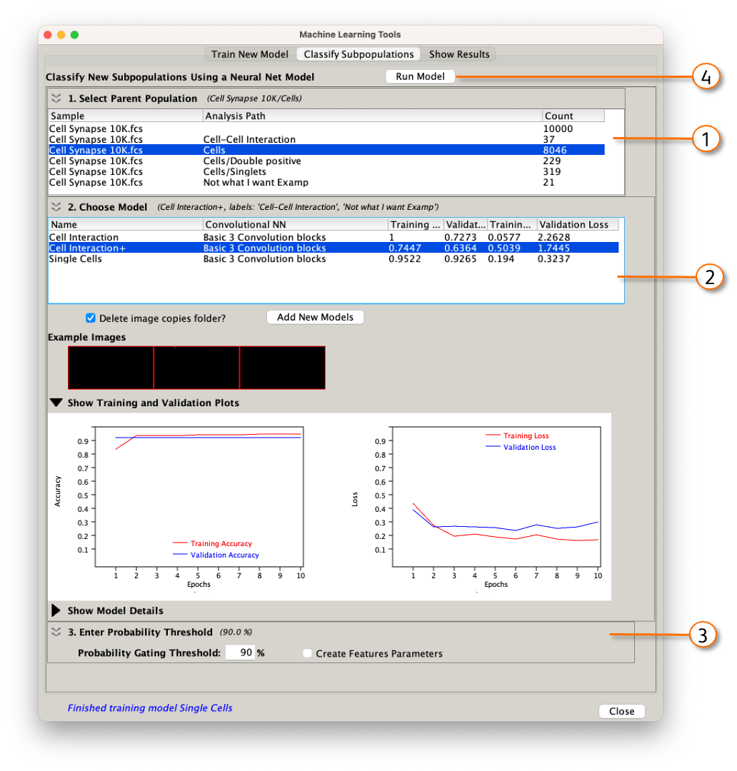 When you train a network, a model gets written into the {Workspace name}/BD CellView Lens/models folder. These are accessible within the workspace to be applied to any population and can be ported to other workspaces either by dragging the model folder into the folder of another workspace or using the Add Model button in the Classify tab. NOTE: To run a network on other data, the same parameters should be present.