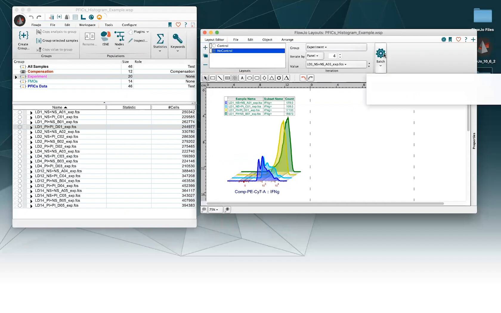 FlowJo vX allows you to create both univariate (histograms, cumulative distribution function) and bivariate (dot, pseudocolor, density, contour, and zebra plots) Overlays within the Layout Editor. Histogram overlays have the added benefit of being displayed offset to one another, the controls of which are discussed further below.