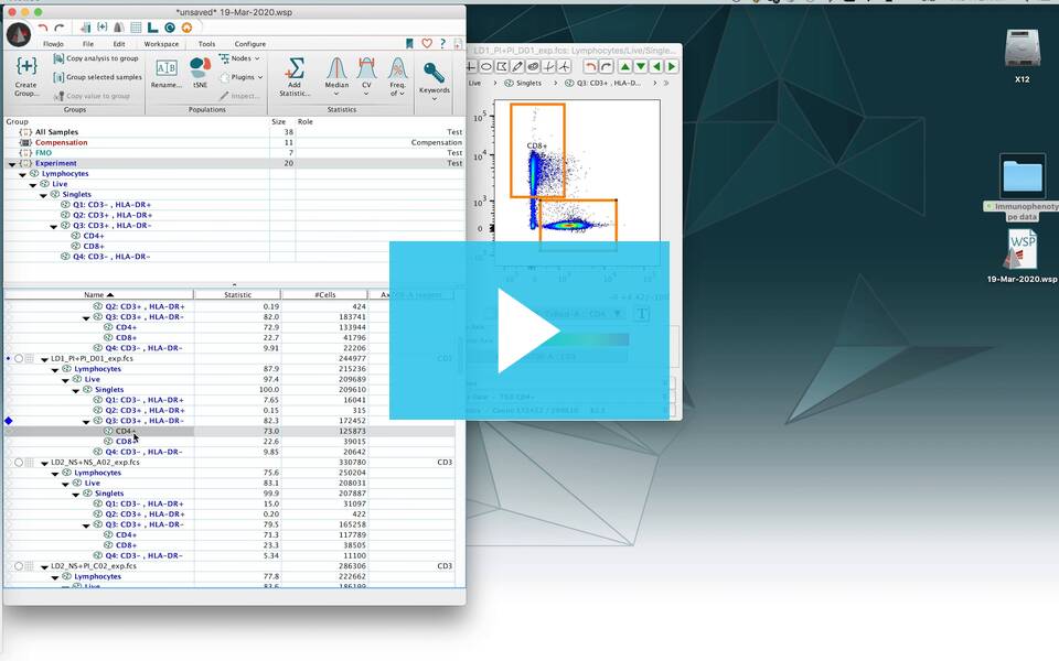 The figure below shows a FlowJo workspace with 9 FCS files in the T-cell group. Follow the link for a description of the FlowJo Workspace. A hierarchy of gates and statistics have been created on Sample B1.
