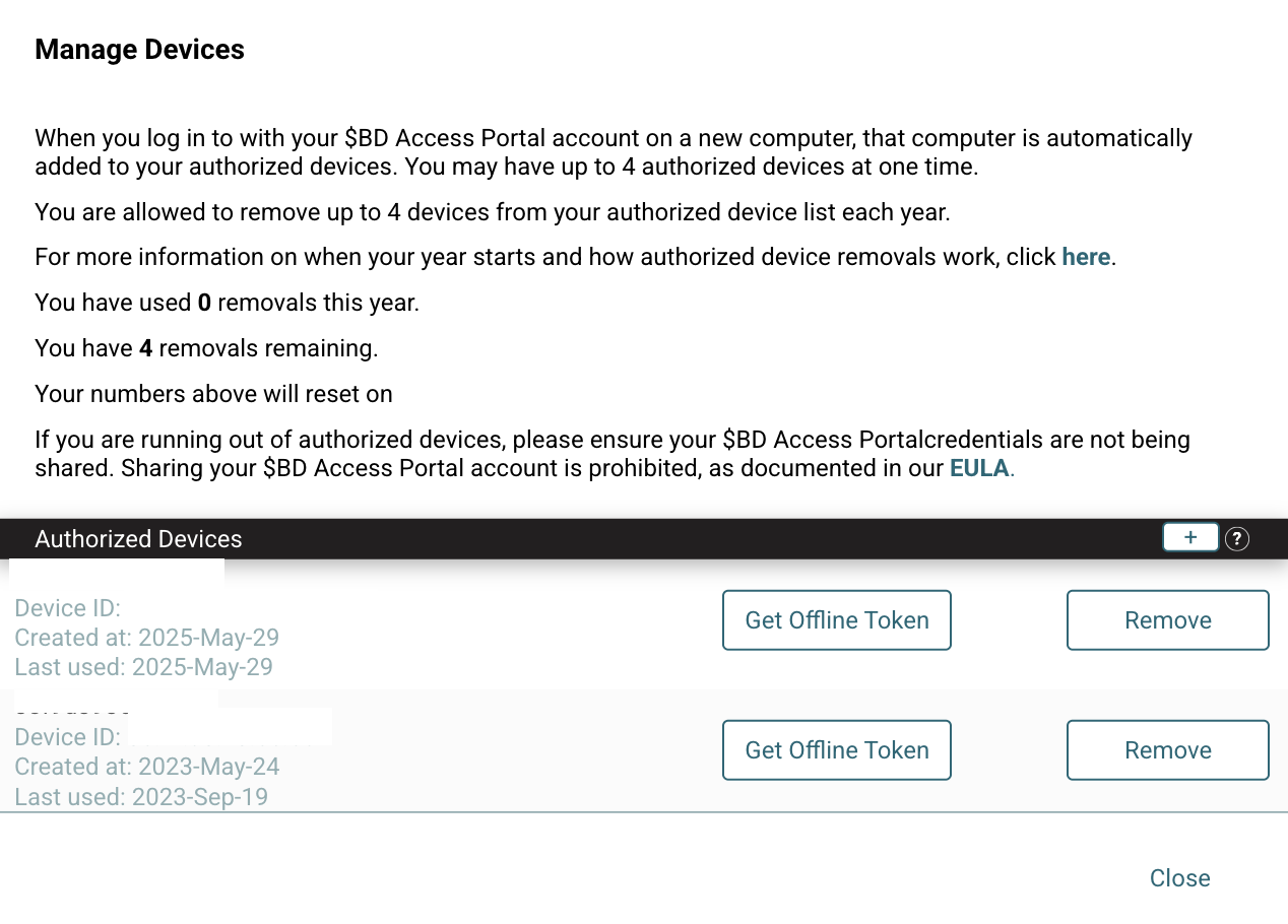This will open a list of the devices that have been accessed using this BD Access Portal account. Locate the device ID that matches the Device Identifier shown in the BD Access Portal application. Press "Get Offline Token" for the matching device ID. This will open a window describing the limitations of the 14 day Extended Offline Token. Select "Create EOT" to generate a 14 day offline token for the selected device. Make sure you select the correct device! The offline token can only be used for the selected device and the portal account can not be used to login to any other devices for the next 14 days.