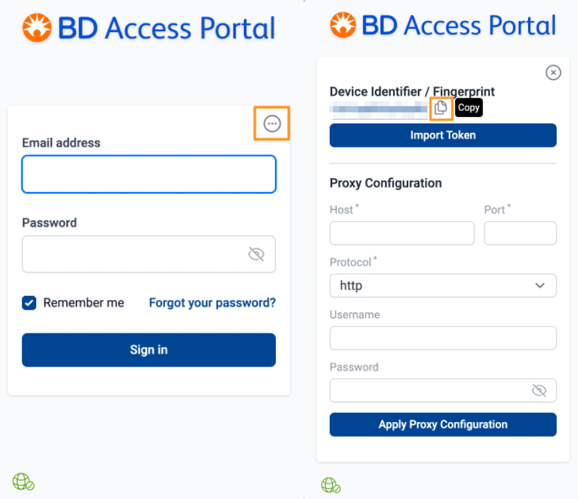 Using the device that you intend to use offline for the next 14 days, open BD Access Portal and locate the three dots in the top righthand corner. The "device identifier/fingerprint" should then be displayed.