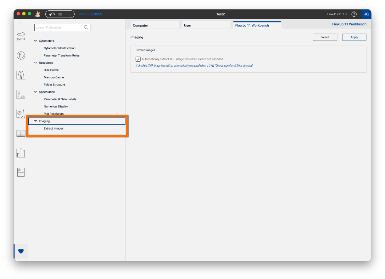 The imaging settings allow you to customize what happens if you load an .FCS file that has an associated Compact Waveform file (.CVW), but no extracted .TIFF files. The default is to have FlowJo automatically extract the .TIFF files from the .CVW. Its a one-time occurrence if you keep the .TIFF files.