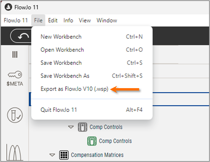 FlowJo v11 workbenches can be exported as v10 workspaces using the “Export as a FlowJo v10 (.wsp)” workspace action under the file menu (Figure 1).
